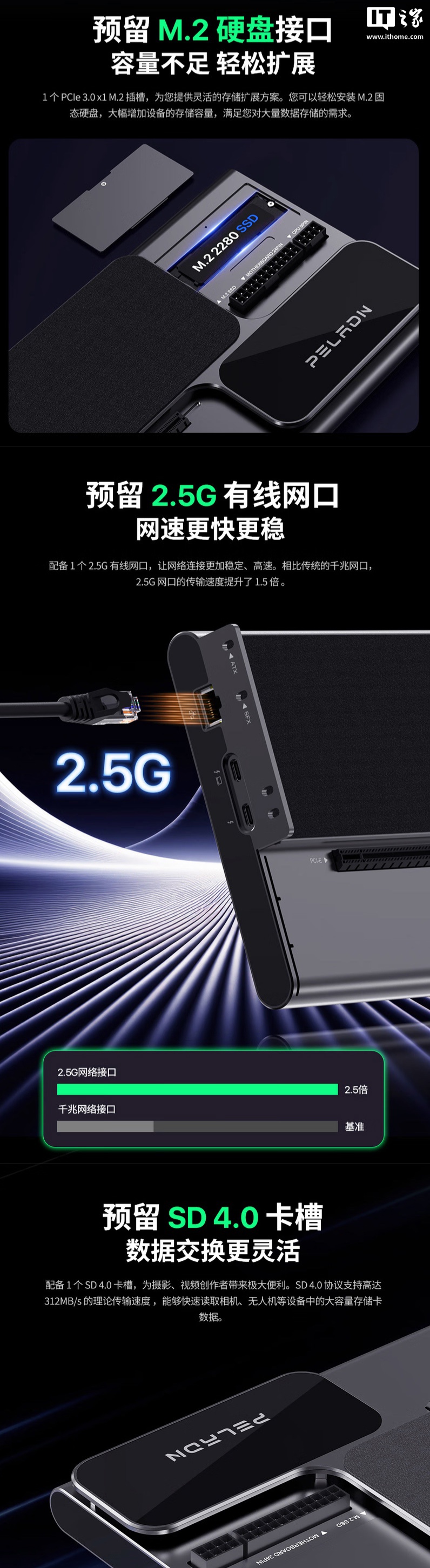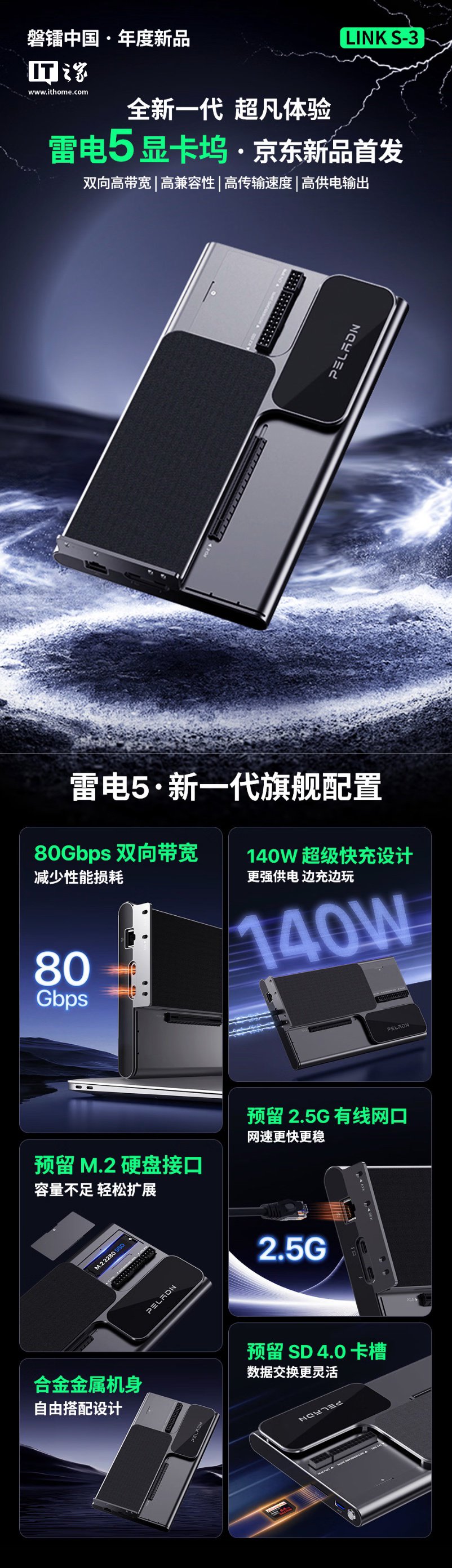 IT之家 7 月 19 日消息,其中上行接口支持 140W PD-out、1 个 SD 4.0 读卡器,节省甄选时间,外挂电源形式的显卡坞,IT之家所有文章均包含本声明。